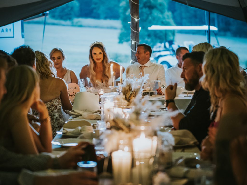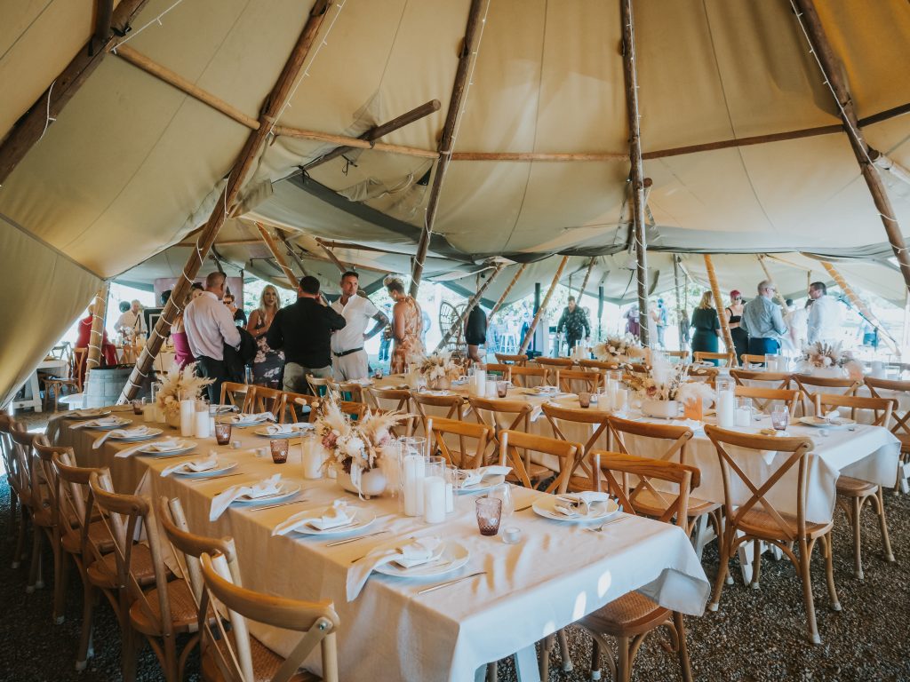 The real showstopper was the tipi reception. Set up on the open lawn near the farmhouse, the tipis stood tall and proud with their canvas sides drawn back to reveal a magical interior. Inside, the styling was a masterclass in rustic whimsy and boho chic.