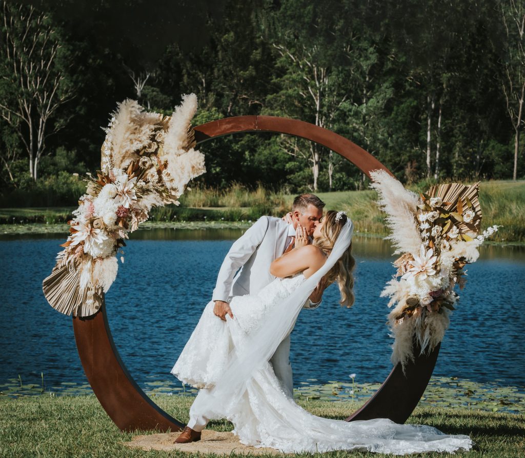 The day began with the most picturesque lakeside ceremony. The bride and groom exchanged vows under a natural wooden arch adorned with cascading dried floral arrangements—think pampas grass, bleached ruscus, and muted pink bunny tails. The soft breeze danced through the petals as the couple said “I do,” with the peaceful lake glistening behind them.