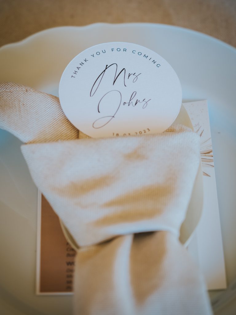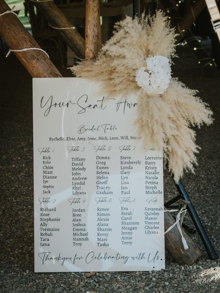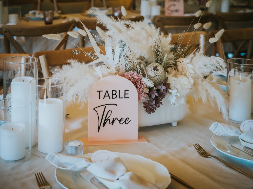 Custom acrylic signage in soft, translucent hues added a modern edge to the boho look. A Welcome Sign & Seating Chart greeted guests, and each table was marked with delicately etched numbers in matching pastel acrylic, styled among clusters of wildflowers and glass bud vases.