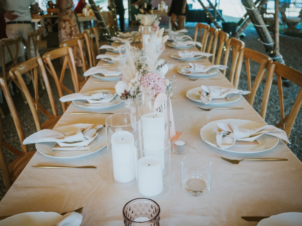 The colour palette was soft and romantic—pastels in blush pink, peach, and buttery creams, perfectly complemented by natural textures. Tables were dressed in flowing linen and decked with low, sprawling arrangements of dried and preserved florals. Candles in varying heights flickered gently in glass cylinder vases, adding warmth and intimacy to the setting.