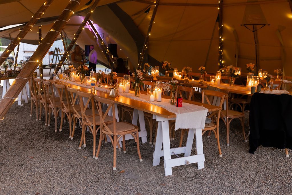 Under the tipis, the rustic charm of timber tables and crossback chairs always looks amazing with fairy lights and candles illuminating the space, and pretty florals adding the finishing touch. Such an intimate and romantic setting!