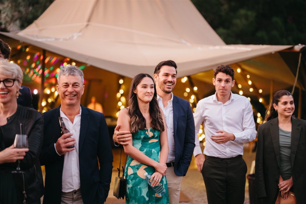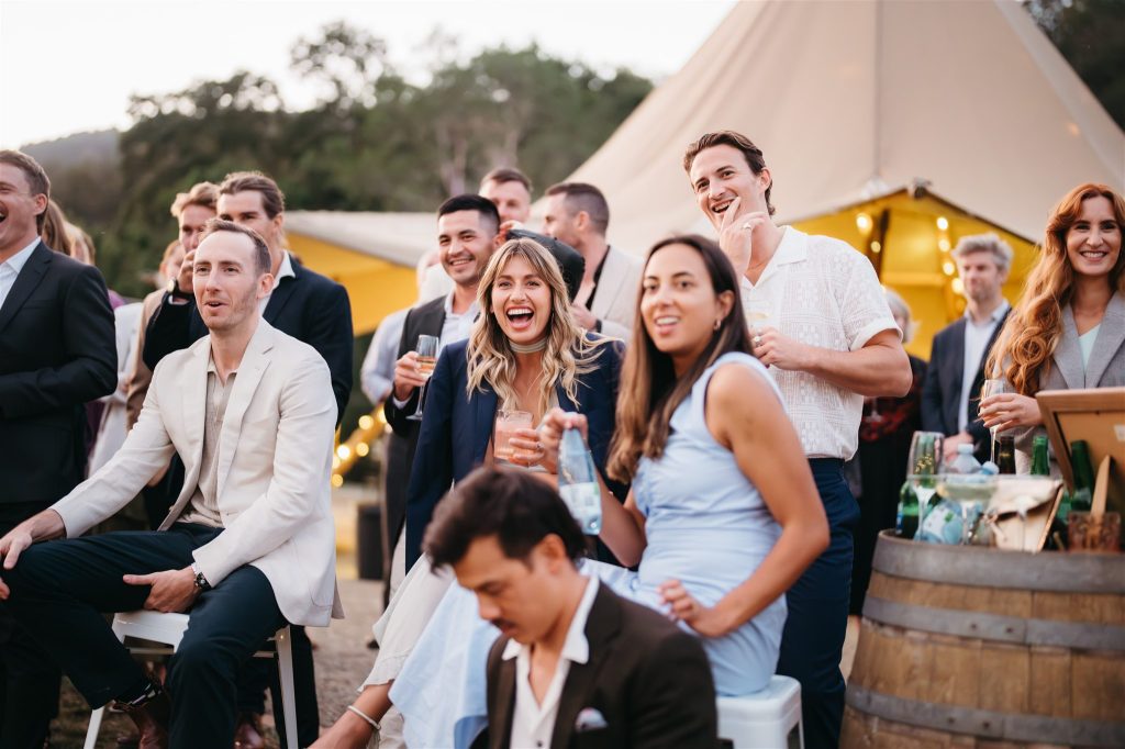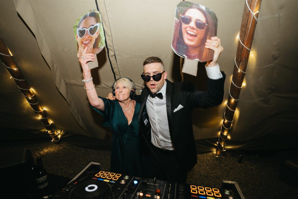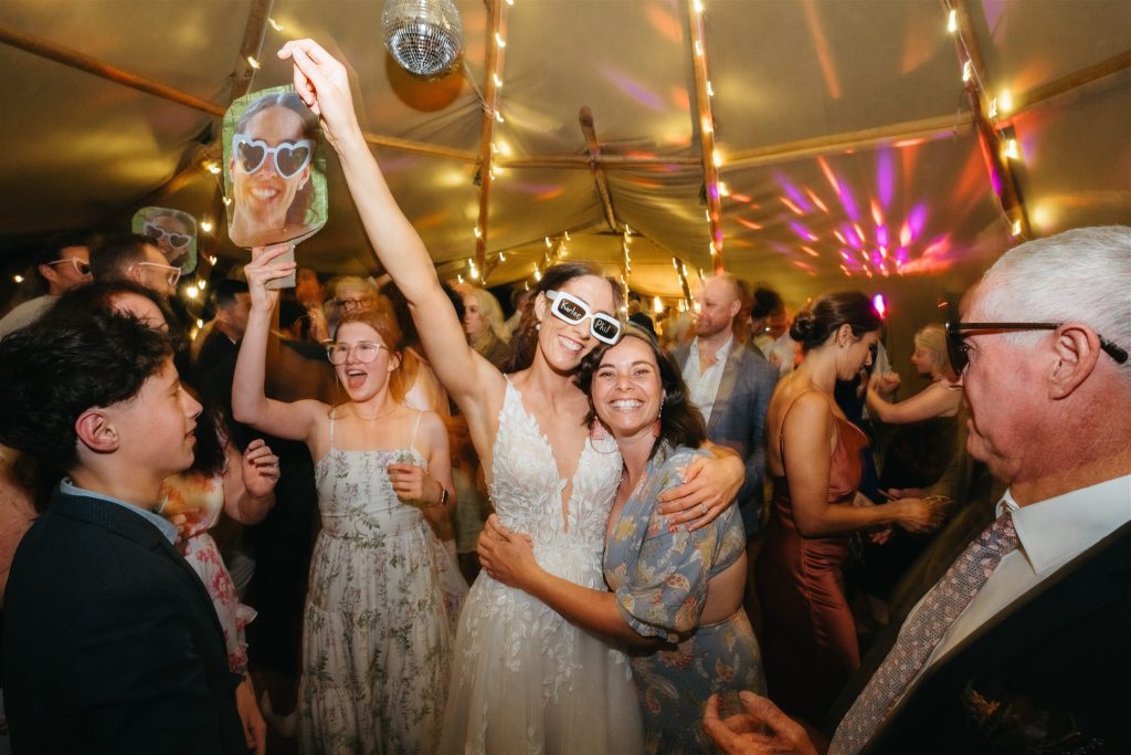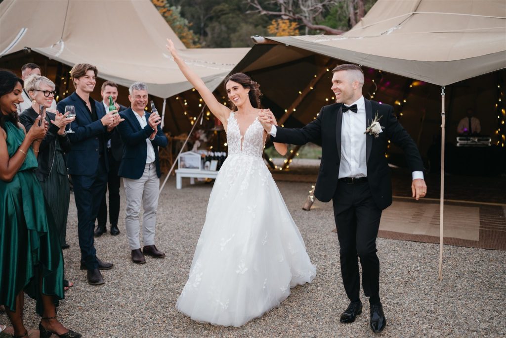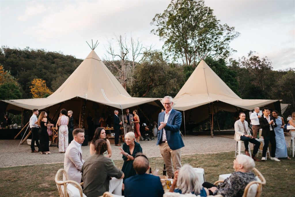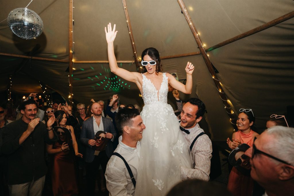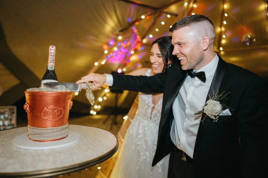 Cocktail hour and speeches were held outside by the tipis, creating a cozy and intimate atmosphere for guests to mingle and share heartfelt words with the newlyweds. As the sun began to set, the couple cut their Moet inspried wedding cake (that’s our kinda cake!!) and danced the night away inside the double tipi amongst the fairy lights, surrounded by their loved ones, Karlee rocking her Keds & lace dress on the dance floor.