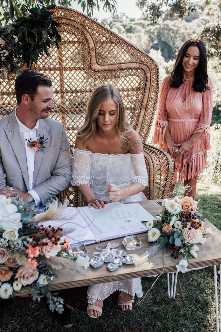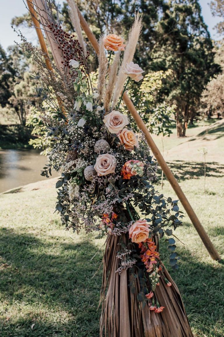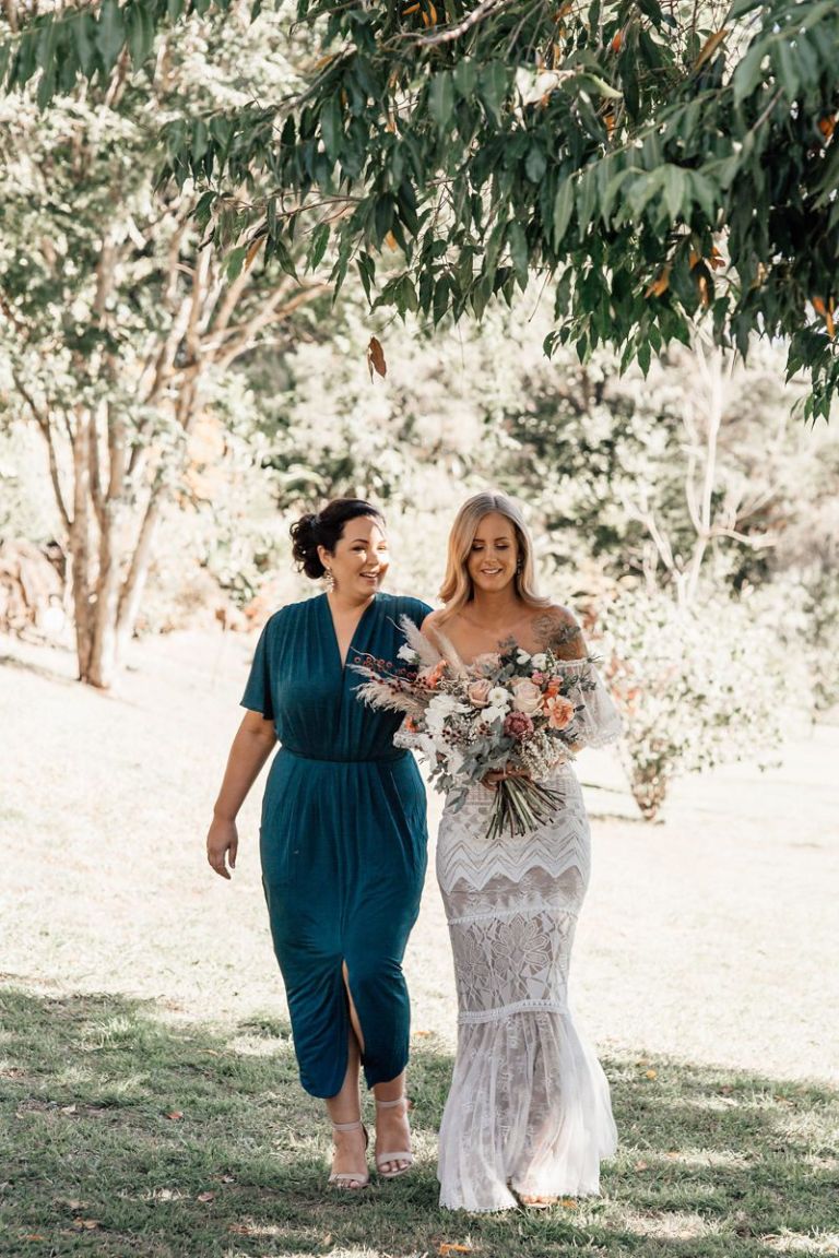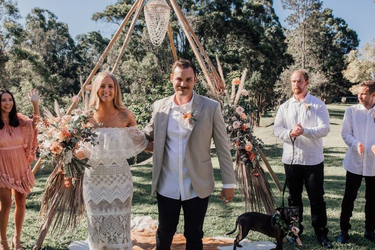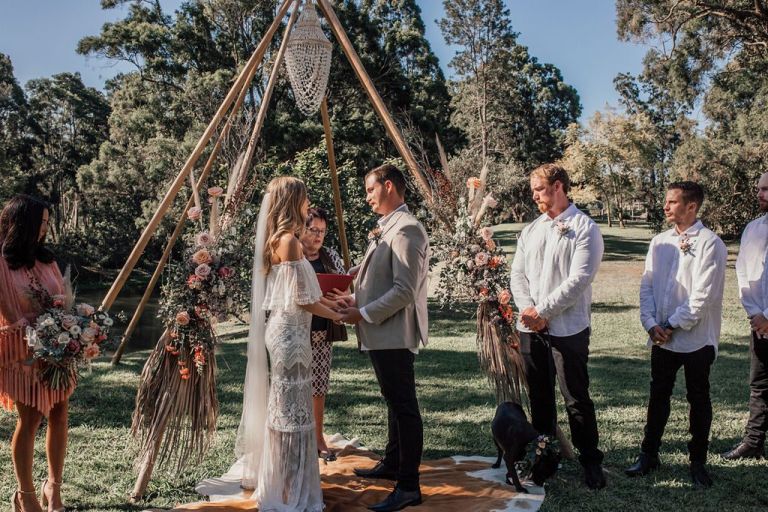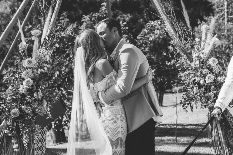 Gemma & Josh chose the stunning grounds of Riverwood in the Gold Coast Hinterland as their blank canvas, and with a team of extremely talented local wedding suppliers, they were able to create the dreamiest of settings to share their love and commitment to each other with all of their favourite people. Every aspect of their special day reflected their personalities, from the boho inspired gown and blooms, to their 4 legged groomsman, and them breaking tradition and having ‘bubble-o-bills’ for dessert instead of a cake, which the guests absolutely loved!