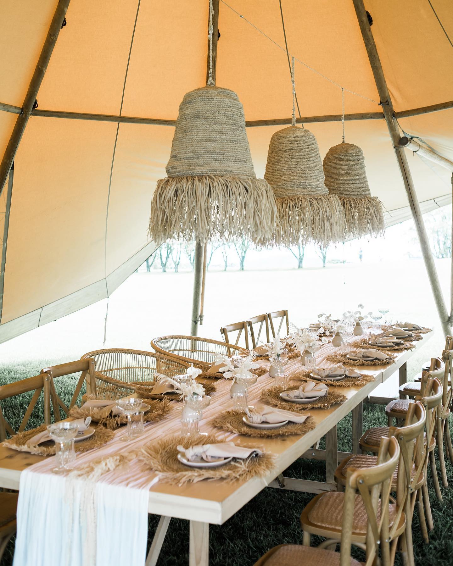 We also love seeing gorgeous pendant lighting making a feature. In combination with the festoon lighting which is included with our tipi installations, hanging pendants create a real wow factor and help personalise your space.
