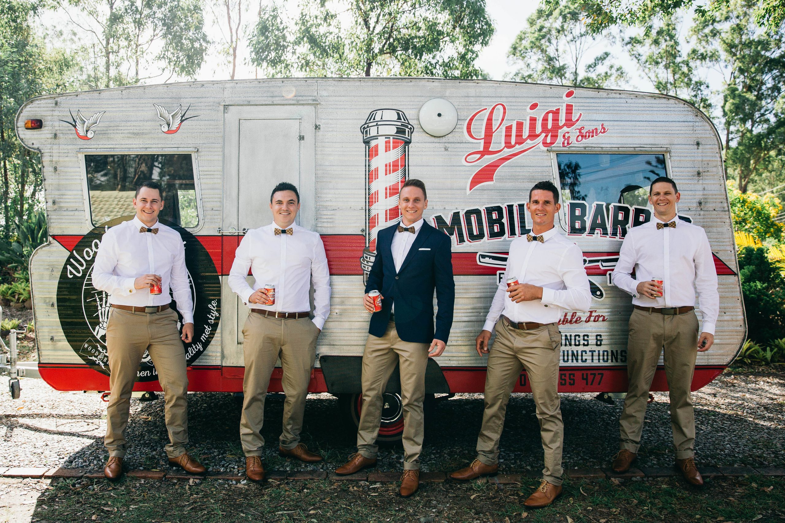 Before the wedding the boys spruced themselves up at the mobile barber van, while the bride squad were in hair and make-up . Having their wedding at home gave them flexibility with all aspects of the wedding, and allowed them to include their beautiful two dogs in the celebrations.
