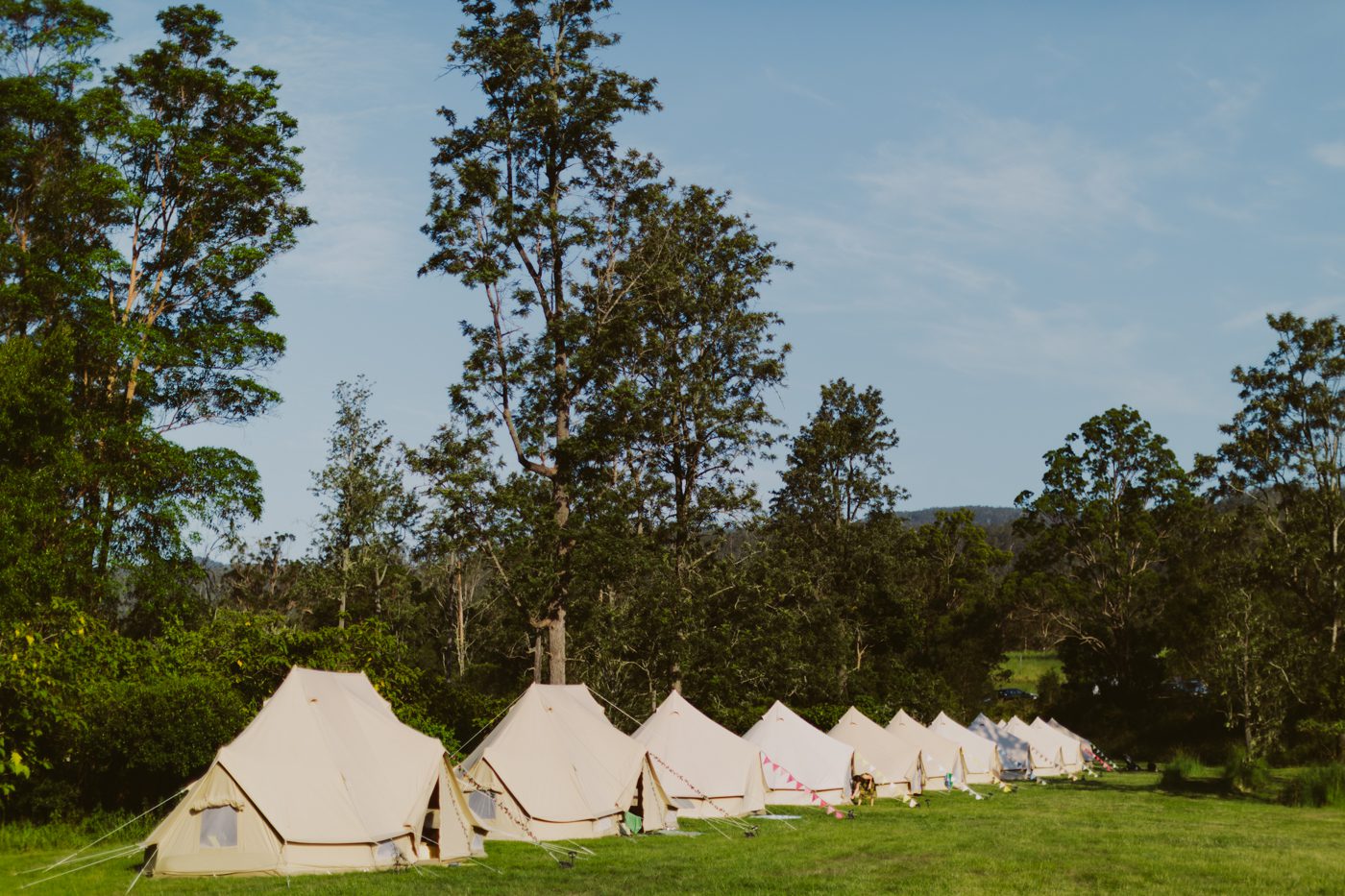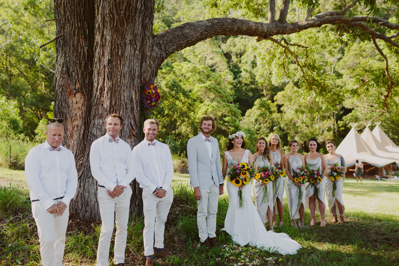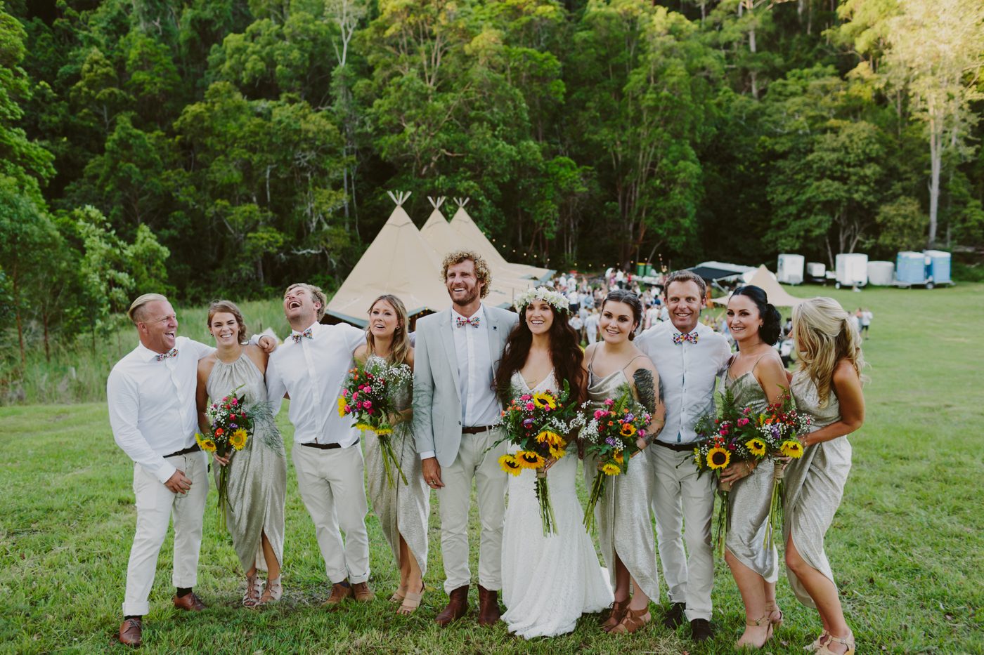 Venue ceremony reception: The Farm House, Numinbah Valley Tipis: Gold Coast Tipis Lighting: Gold Coast Tipis Florist: Rachel from Bunches Gold Coast Styling: Friends Cake: Marie Luxford Dress: Pearl Bridal Gold Coast, Designer: White April Hair: Gaylene – Get Smart Hair Make-up: Bride: Clare Fisher MUA Bridesmaids: Loren Lewis MUA Suits: Politix, Uniqlo, Zara Mens Bridesmaid’s dresses: Shona Joy Bespoke bowties: Liz Milnes Glamping tents: Glamping Days Hire Co Furnishings: Gold Coast Tipis, Trader Trove and Event Stylist and Co Photography: Beck Rocchi Photography and friend, Matty Baker Film: John Wiley – Deltoid Productions Catering: Salt Meats Cheese Bar: Austream Affairs Wedding planner: Bride and Groom Celebrant: Sue Fisher (Brides Aunty) Musician: Lily Budiasa and Kada Music DJ: Kane Dignum – aka Little Fritter Showers/toilets: Viking Rentals