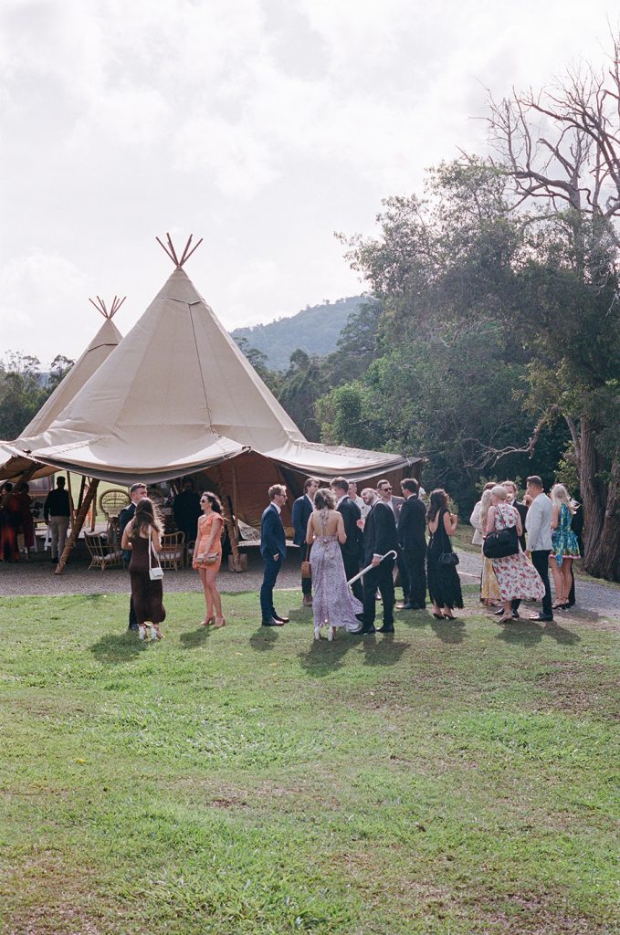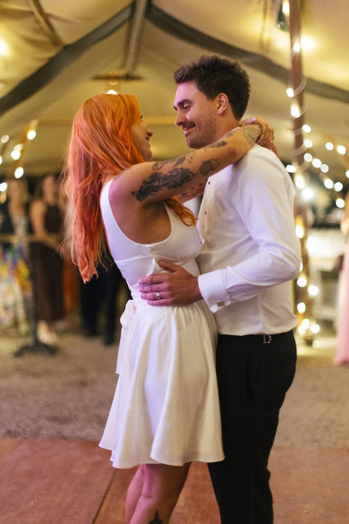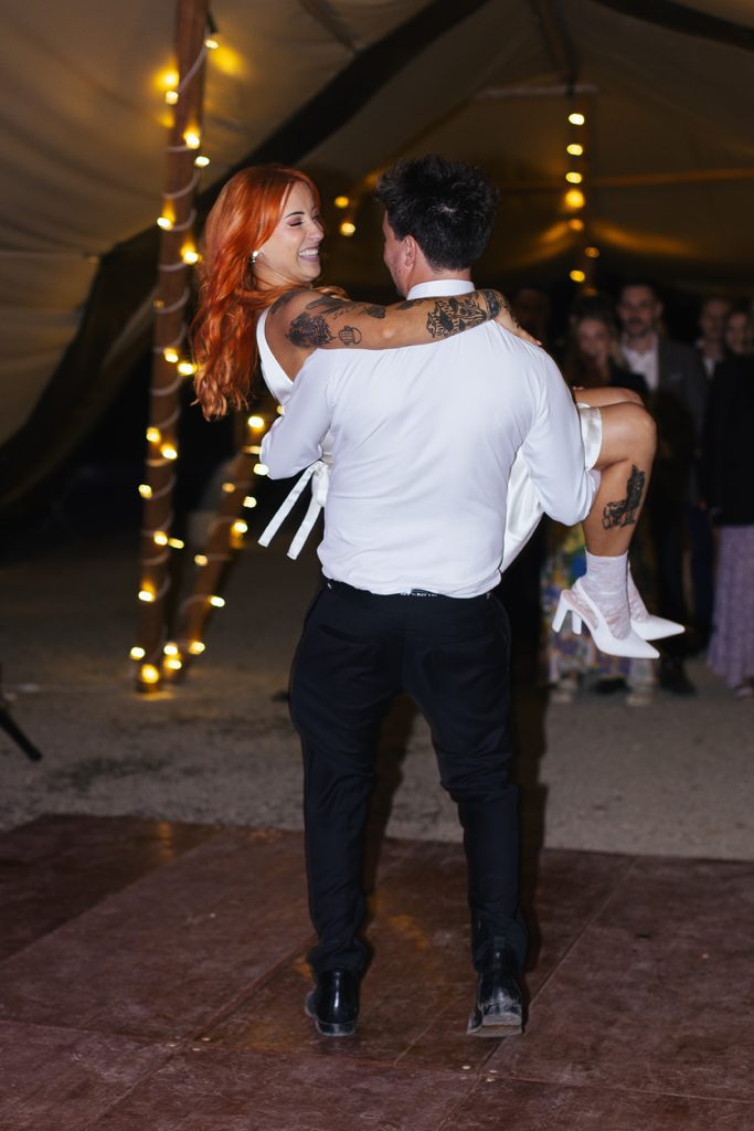 As day turned to night, the atmosphere transformed, along with a stunning change of dress, and Emily and Pat danced the night away under the twinkling fairy lights of the double Kata tipis, creating magical memories that would last a lifetime.