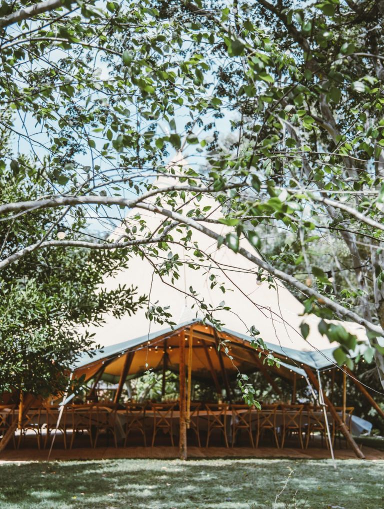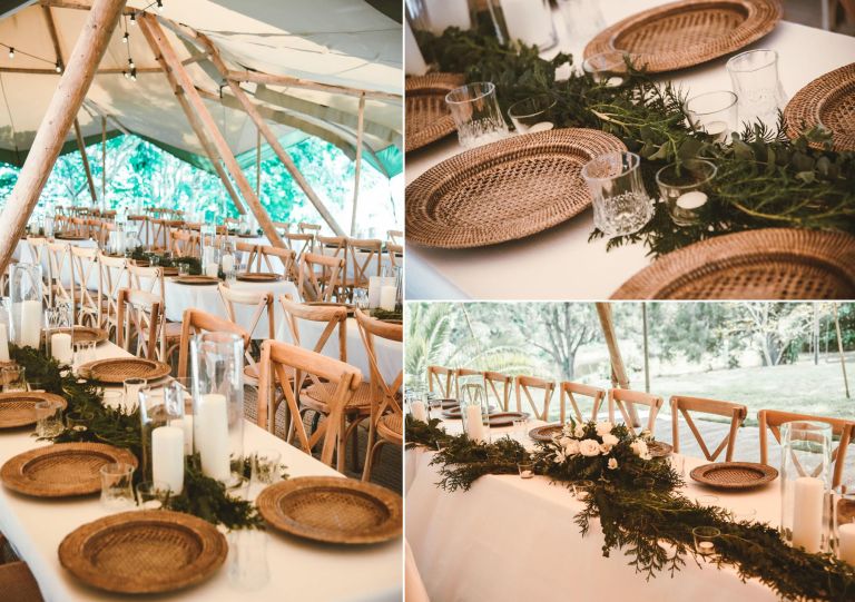 Riverwood Estate is set in the idyllic and picturesque Gold Coast Hinterland within the foothills of Tamborine Mountain. We love this stunning private retreat which is nestled along the banks of the Coomera River. The lush, green gardens are the perfect backdrop for a tipi wedding, suiting those who love the romantic country style, or the bohemian bride who loves the unique wedding experience. We were so excited to get back to Riverwood recently. As restrictions are lifting we love seeing our couples finally get to celebrate the way they envisaged! Our double kata provides the perfect space for a large wedding without dance floor (dancing was still restricted at this stage) and the floor matting is a must at Riverwood, saving their manicured lawns from damage. The One Day House provided the oak crossback chairs and table top items to create this beautiful modern rustic look 🙂