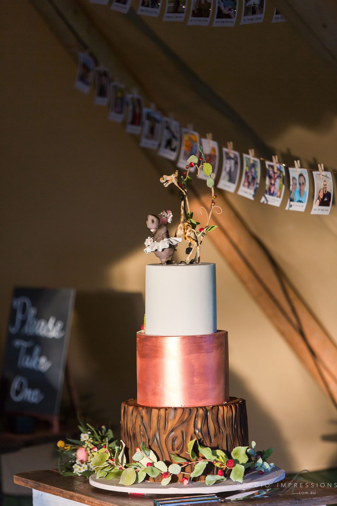 How do you describe your style and where did you find your inspiration? I can’t say I had one particular style, but I knew what I wanted. I wanted the day to reflect the memories that I had created with my husband and to be in the natural environment. I most definitely wanted a more relaxed party vibe than a formal wedding. The tipi was mainly our wet weather backup, but it also gave a safari feel. Fire pits, lanterns and directors chairs took me back to our time in India. Wine barrels to reflect our many vineyard tours. Safari animal figures and prints to reflect Africa (our all-time favourite adventure!). A mix of natives and roses in my bouquet represented the bush and vineyards. Hay bales and hessian to blend with the natural setting, but also to create a more casual feel. I also had a few sentimental items/ photos on the gift table that represented those nearest and dearest including my Dad who passed away several years ago. My cake topper of a hippo bride and a giraffe groom was made as a funny reference to some events that happened to us in Africa.